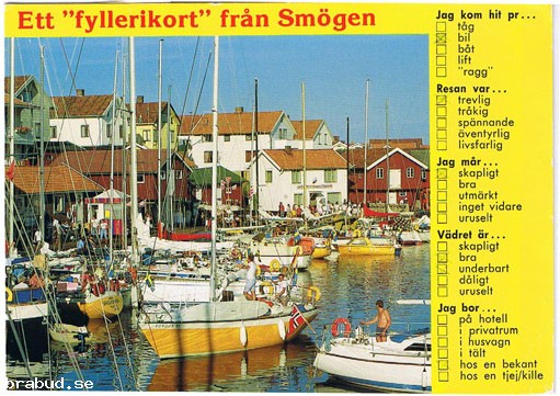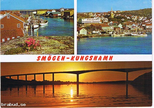 Smögen (2 kort). 1). 3-bilds vykort från Smögen-Kungshamn i färg från 1970-talet. Förlag: Tekla Bengtsson, nr: 596. Postgånget 9. 8. 1976 med otydlig stämpel på Grisslor, 85 öre blå. 2). Ett "fyllerikort från Smögen " i färg från 1980-talet. Förlag: Carla-förlaget, nr: 1731. Postgånget 18. 7. 1982 från Göteborg på Europamärket 1982, 1,65 kronor.